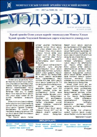 Монгол Улсын Хүний эрхийн Үндэсний Комиссоос улирал тутам эрхлэн гаргадаг "Мэдээллийн хуудас”-ны 2017 оны 2 дугаар дугаарыг энд [1.61 Mb] дарж уншина уу....